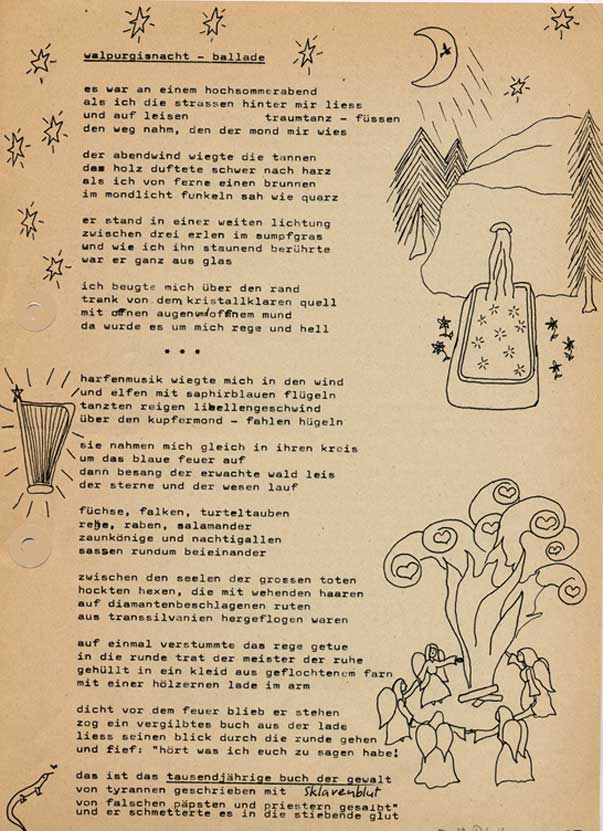 Ein Werk mit literarisch-starken Texten, aufgenommen mit bedeutenden Schweizer Musikern und Ton-Meister Helge v. Dyke. Darauf ein Remake in Mundart meines Klassikers aus der Hippiezeit «Walpurgisnacht». Hier die erste Walpurgisnacht-Illustration aus dem «Free Blettli» der Berner Härdlüttli.